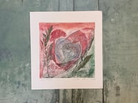 Abstract collagraph heart print in soft chalky tones of warm rosy pink, green grey and soft blue. A delicate, romantic composition.