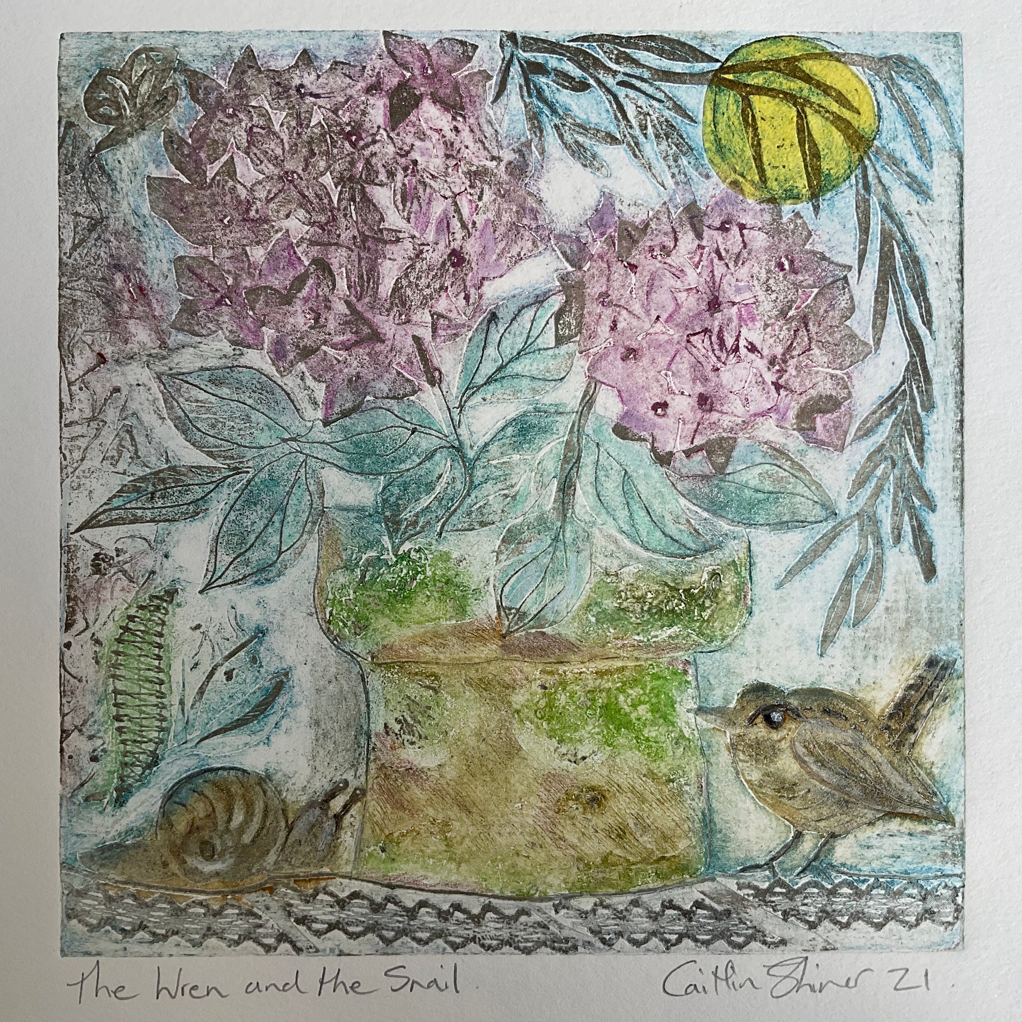 Original unframed Collagraph print of pretty hydrangea flowers in an weathered terracotta pot with a little Wren watching a Snail in the garden.